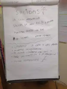 Bajo la técnica de brainstorming, las supervivientes de trata abordaron el aspecto de las salidas y la distancia que hay que mantener mientras que las educadoras resolvíamos dudas del tiempo, la distancia, cuándo poder salir. Es importante distinguir los acuerdos y consensos de nuestro recurso que facilitan la convivencia y las que impone el gobierno desde el punto de vista de salud pública. Tras la reunión, las mujeres entendieron que no cumplir estas últimas normas llevaría aparejada una multa por parte de la policía que deberían asumir individualmente.
